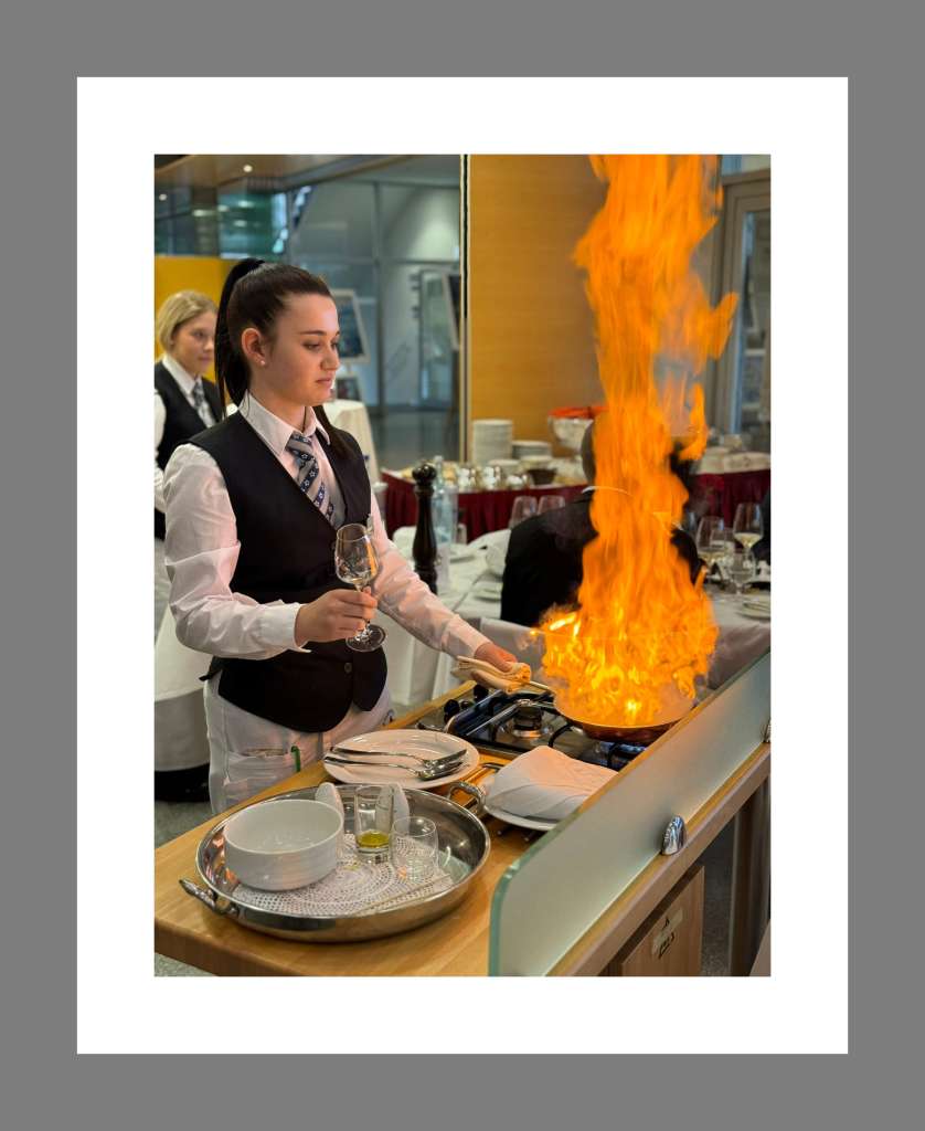 Im Laufe des Abends wird ersichtlich, was das Besondere an den Prüfungen der Zillertaler Tourismusschulen ausmacht. Neben köstlichen Menüs, die von den Schüler:innen zubereitet und serviert werden, bekommen die Gäste verschiedenste Arbeiten an den Tischen zu sehen, wie man es an anderen Schulen nicht vorfindet. Tranchieren von Entenbrüsten, Marinieren von Lachs- und Forellentartar, Flambieren von Garnelen und Süßspeisen sind nur einige Aufgaben, welche die Kandidat:innen nicht nur vor den Augen der Gäste zu erledigen haben.